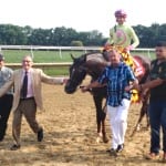 Rider Eriluis Vaz and trainer Edward Graham (in tie) celebrate Hardest Core’s Cape Henlopen win.