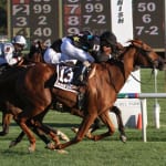Cyclogenisis wins the Laurel Futurity at Laurel Park. Cyclogenisis is trained by George Weaver for Matthew Schera. Photo by The Racing Biz.