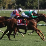 Cyclogenisis powers home in the Laurel Futurity. Cyclogenisis is trained by George Weaver for Matthew Schera. Photo by Laurie Asseo.