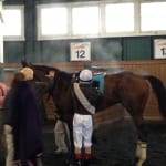 Steam rises off Golden Years’s back as Victor Carrasco takes the tack off. Photo by The Racing Biz.