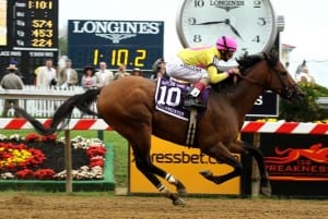 Kennesaw Mountain stuck his nose in front at the head of the lane and held off D C Dancer in a long duel to the wire, his third straight win, at Pimlico.